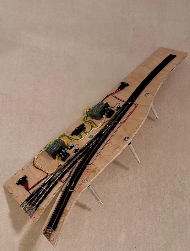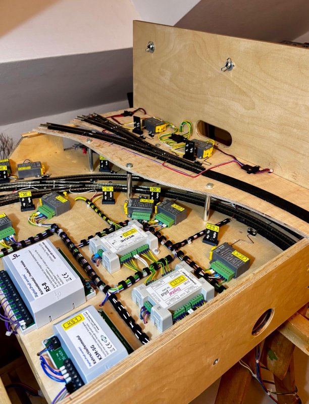Die bisher gezeigten Schritte zum Unterbau, Gleise verlegen, Elektrik- und Elektronikinstallation wiederholen sich auf allen drei Segmenten des ersten Schattenbahnhofs. Besonders herausfordernd finde ich immer wieder das Verlöten der Segmentübergänge, speziell die Einhaltung der richtigen Wärmzeit: zu kurz mit dem Lötkolben dran - kalte Lötstelle; zu lang drangehalten und die Kupferkaschierung hebt ab. Anyway.