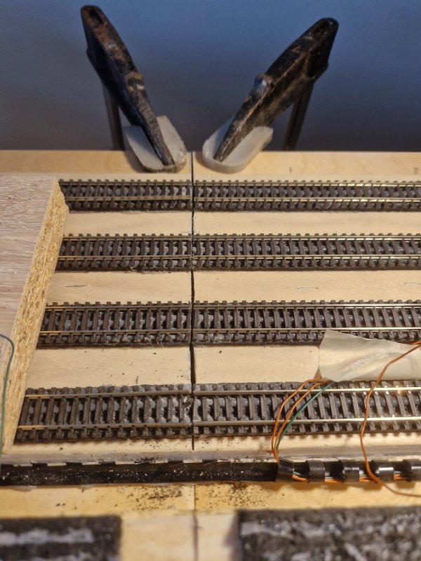 Nach dem anbringen von zwei Winkeleisen unter der Anlage zur Führung für die Handstichsäge, habe ich noch die Gleise an den zu trennenden Stellen entfernt. Weiterhin gleich noch 3 Löscher für die Zentrierstifte und 4 Löscher für die Verbinder gebohrt.