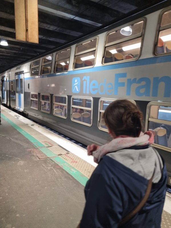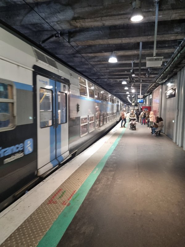 Zur nächsten Bahnstation, dieses Mal RER. Das war ein Eindruck, Doppelstöckig im Tunnel, eine Länge die nicht abbildbar war, Anfahrgeschwindigkeit enorm und 5 Plätze in einer Reihe (Oberstock)