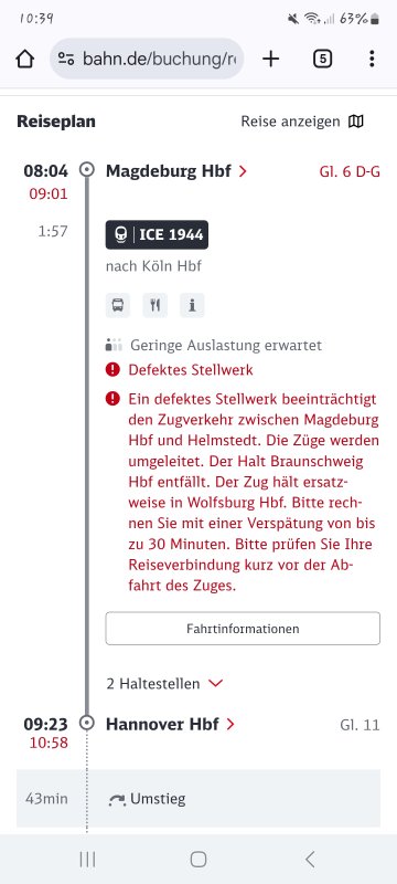 Und auch unsere Anzeigetafel zeigt den Ausfall an. Was nun? Sohn war schon weg, durch Baustellen auf A2 wäre Braunschweig nicht mehr pünktlich erreichbar, also auf Alternative Verbindung gedrückt.