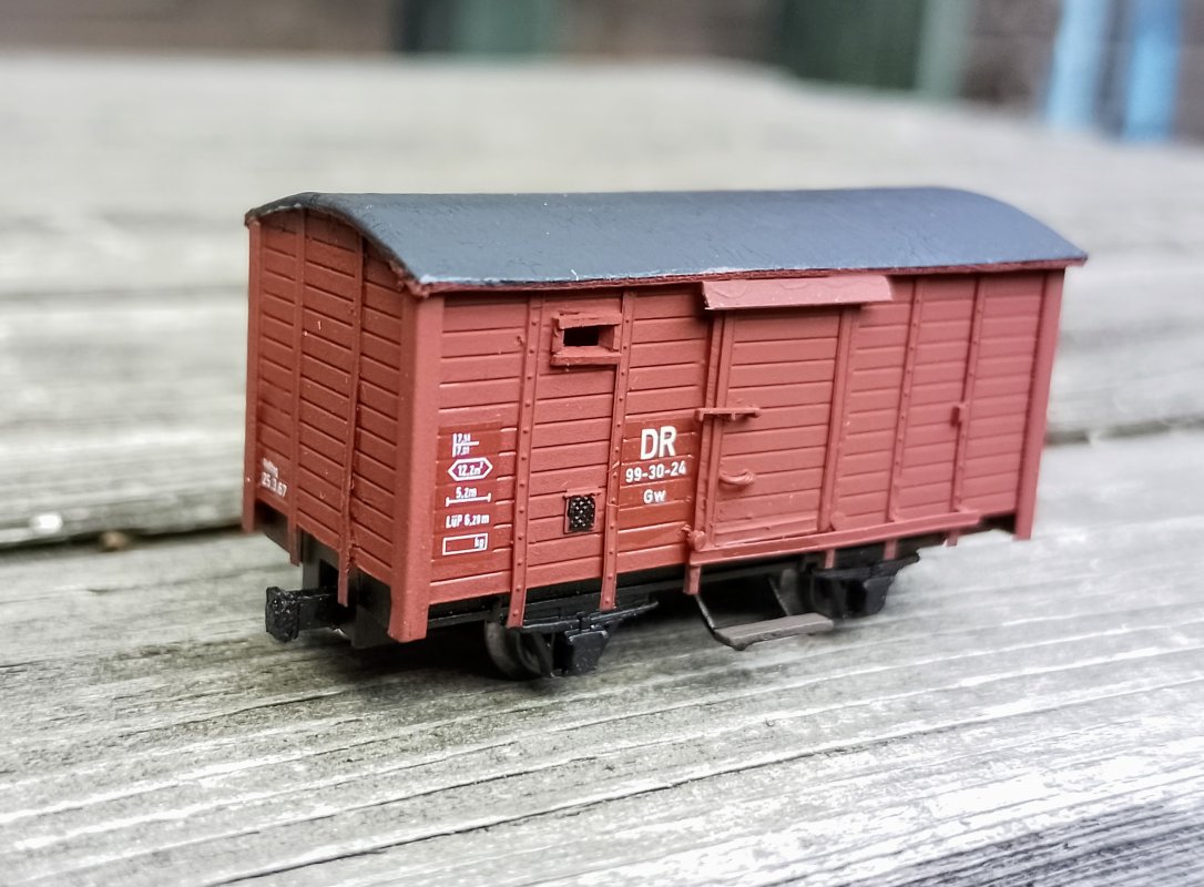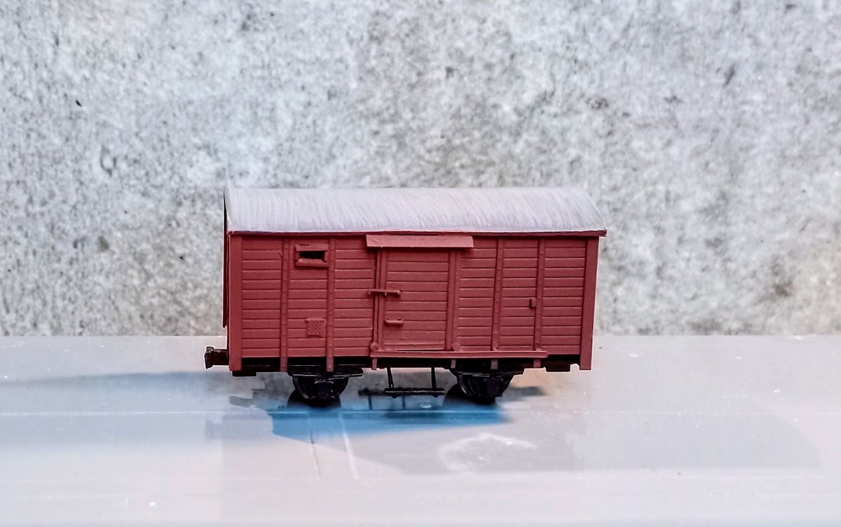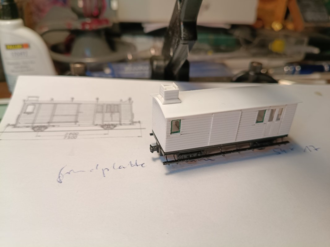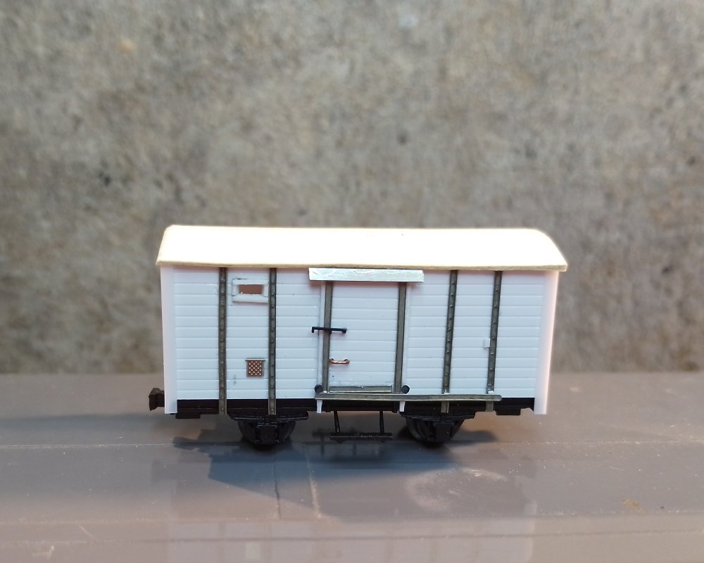 Dieser gedeckte Güterwagen mit 2,60 m Achsstand wurde 1894 in Görlitz für die FKB gebaut. Mein Modell entstand im letzten Sommer. Ein passend gemachtes N-Fahrgestell mit einem Aufbau aus Kunststoff-Platten (V-Platten) und Profilen aus der Digitalzentrale. Ich denke, die Bilder lassen die Bauweise gut erkennen.