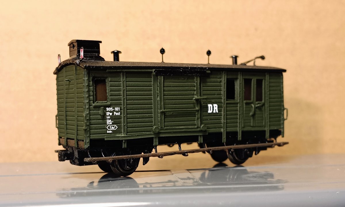 Dieser Wagen hatte bis zum Schluss an beiden Seiten durchgehende Trittbretter. Auf meiner kleinen Anlage kommt er entweder als Begleitwagen in Güterzügen oder im Verbund mit P-Wagen zum Einsatz. Schließlich geht es nicht ohne Packwagen, da von hier aus die Gewichtsbremse der gekuppelten und mit der Bremsleine verbundenen Personenwagen bedient wurde.