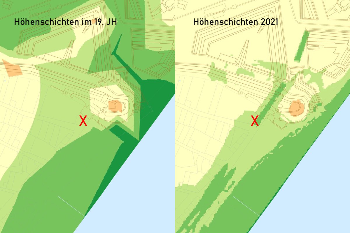 Bei [4] gab es auch eine Ansicht der geänderten Bodenlage -- hier: Siedlungsentwicklung von den Anfängen bis ins 19. Jahrhundert