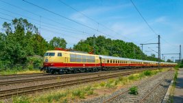 Wagen bestehenden Zug mit einem Gewicht von 470t ohne "Angstlok" in beeindruckender Manier die gut 250km, teilweise fast mit ihrer Höchstgeschwindigkeit von 140km/h. Es war ein Genuss, bei geöffnetem Fenster im 1.Wagen dem Sound der 3-Zylinderlok zu lauschen.