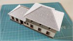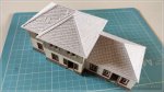 Erst nach Fertigstellung der grundlegenden Dacheindeckung wurden die einzelnen Bauteile zu den beiden Dächern (Hauptgebäude / Anbau) zusammengesetzt. Aufgrund der letztendlichen Materialstärke von 1,2 mm (Druckerpapier/Architekturkarton/Druckerpapier) mussten dazu alle aufeinander stoßenden Kanten 45° angefast werden, so dass die Schindelreihen ohne Spalte oder Freiflächen direkt aneinander passten. Ganz zum Schluss wurde dann noch die Eindeckung der Firste ergänzt ...