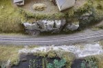 Mit dem Bahnbau wurde natürlich auch diese Verbindung durchtrennt. Der Überlauf endet jetzt oberhalb des einzeln liegenden Felses im neu geschaffenen Hang. Man erkennt dies gut daran, dass die Büsche in diesem Bereich deutlich höher und dichter stehen. Auch der Bewuchs am Hang ist dunkler und grüner - neben dem starken Graswuchs vermoost der Boden hier sehr schnell. Das Wasser sickert den Hang hinunter und sammelt sich zum Teil auch im hangseitigen Graben der Bahnstrecke. In diesem Graben steht trotz aller Pflege das Gras, während die gegenüberliegende Seite fast trocken liegt.