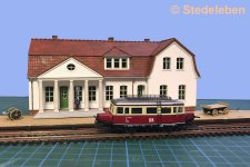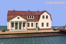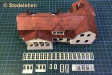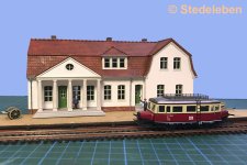 Anbei das Ergebnis in Sachen Bahnhof Großbommeln. Jetzt liegen die Teile einbaufertig da, können jedoch immer noch nicht eingebaut werden, weil dem etwas anderes Unangenehmes vorausgehen muß: Die innenseitige Auslegung der Außenwände gegen Durchscheinen. Grrrrr ...