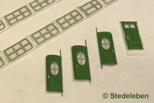 Auch die Türfenster des Empfangsgebäudes sind verglast. Die Scheiben sind, wie üblich, nur aus bestimmen Blickwinkeln an Lichtreflexen erkennbar. Besser zu sehen sind auf diesem Bild hingegen die Beschläge. Die Langschilder der Drückergarnituren sind 2,0 mm lang und 0,8 mm breit. Die bauzeittypische Form herauszuarbeiten hat ein bißchen Geduld erfordert, weil man bei 0,2 mm starkem Polystyrol die Feile nicht sehr beherzt ansetzen kann. Genauso wichtig war mir, daß die Türdrücker frei stehen, weil sie dann Schattenwürfe ergeben. Umgerechnet haben die Drücker einen Durchmesser von 20 mm, was mir an Vorbildtreue genügt.