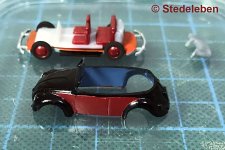 Weil die Bastelnacht mit einem Bahnhofsgebäude endete, an dem erst die Farbe trocknen muß, bevor es sich wieder zusammen- und ins rechte Licht setzen läßt, sei hier ersatzweise gezeigt, daß es schneller als gedacht mit den beiden VW Käfer weiterging. Da gerade die Farbtöpfe offen waren, erhielten die Räder rasch ihre Radkappen. Danach wurde das kleine Schwarze zusammengesetzt. Bis hierher ganz hübsch, aber es fällt unangenehm auf, daß das Innenleben fehlt. Es bleibt also viel zu tun und ... spannend.