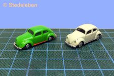 Einen Beitrag kann ich schon mal einsparen, indem ich hier als Zugabe den nächsten grünen Käfer präsentiere. Diesmal kein dunkel-, sondern quietschgrünes Exemplar mit orangefarbenem Chassis. Was die im Westen so alles hatten! Die Reifen sind bereits geschwärzt und die Radkappen und Stoßstangen glitzern wie beim windigen Schrottwagenhändler auf dem Ruinengrundstück an der Ecke ...