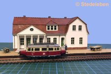 Zum Beispiel wies das ideengebende Empfangsgebäude in Perleberg Süd eine schöne, an einem filigranen Kragarm hängende Uhr in der Mitte des Giebels auf. Diese hätte ich mit einfachsten Mitteln robust und anlagentauglich nachgestalten können, werde es aber unterlassen. Desgleichen die Blumenkästen, die ich für die Gauben vorgesehen hatte oder den Fahrradbügel an der Straßenfront. Denn die Überdetaillierung würde das Modell der klaren Kontur berauben: "Jetzt ist es toll, aber dann sieht es wirklich bloß noch nach Modellbahn aus", lautete die heutige Warnung meines Haushaltsvorstands. Folglich werde ich sogar den Schriftzug "Großbommeln." nicht mehr in Einzelbuchstaben auf den Putz setzen, sondern Schilder auf dem Bahnsteig aufstellen, ebenso, wie die Uhr. Selbst die Gardinen im Obergeschoß werde ich so wählen, daß sie eher zu vermuten als zu erkennen sind.