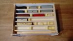 Meine Modelle bewahre ich auch in solchen Kisten auf. Die gab es vor Jahren mal auf dem Baumarkt. Mittlerweile sind sie auch im Netz erhältlich, z.B. hier. Dazwischen werden Leisten eingesetzt und alles entsprechend ausgepolstert. Die Polsterung fixiere ich mit doppelseitigem Teppichklebeband. Ich habe noch eine große Kiste davon, dort hinein kommen dann später die Gebäude. Das Ganze ist also noch ausbaufähig.