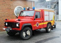 Das war ein Schlauchwagen vom Brandvæsen in Bredebro, der auf der 1983 eingeführten neuen Baureihe basiert. Man unterschied nur zwischen One Ten oder Ninety im Sprachgebrach, was auf den Radstand zurück zu führen ist. Bis zur Produktionseinstellung 2016 wechselte nicht mehrfach der Besitzer von Land Rover, sondern auf die Motoren. Nicht immer zum Guten. Der letzte war der schlimmste. Ford baute einen Diesel in die TD4-Baureihe (erkennbar an dem Buckel auf der Motorhaube), der überhaupt nicht standfest war.