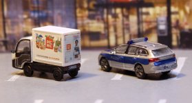 Hier dann mal der Werdegang der Wichtelei: Jakob hatte als Interessengebiete Tram und Stadt in den modernen Epochen angegeben. Außerdem hatten wir vor kurzem darüber gesprochen, dass es ihm noch an Polizeifahrzeugen in blau mangelt. Da ich vor kurzem in einer anderen Stadt einen Goupil G4 - französischer Kleinst-Elektrotransporter - geknipst hatte, der für einen Lieferdienst Einkäufe ausfährt, sollte es dieser werden. Und außerdem musste ein moderner Streifenwagen her, und da passte meiner Meinung nach gut der Skoda Octavia Combi der 4. Generation, den es bei Panzershop gibt. Dieser bekam Decals, passende Bradenburger Polizeikennzeichen und einen Sondersignalaufsatz, den ich vor längerer Zeit mal für moderne PKW konstruiert hatte (in Anlehnung an eine Konstruktion von