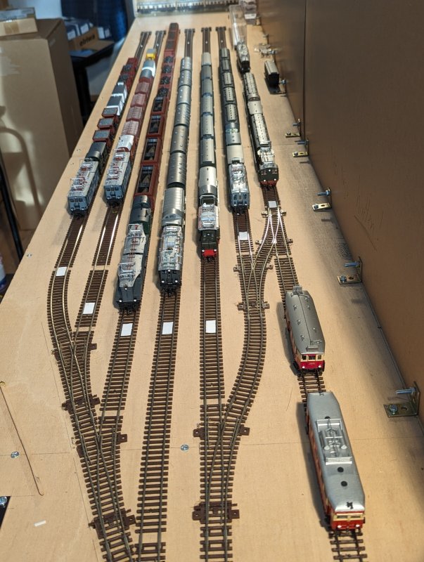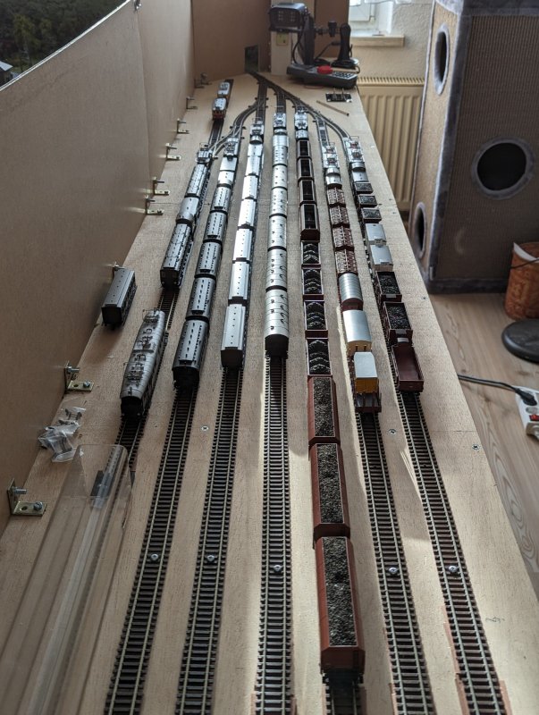 Einblicke in den gefüllten Schattenbahnhof. Vor dem Kohlezug steht jetzt eine E 92.7.