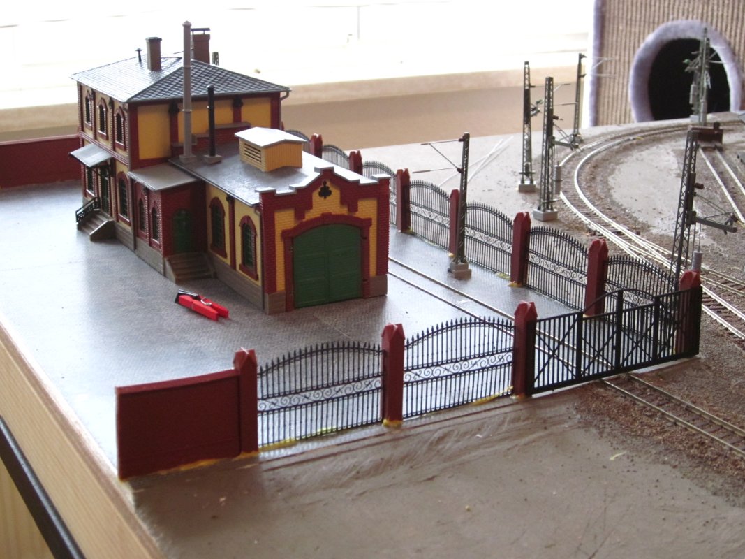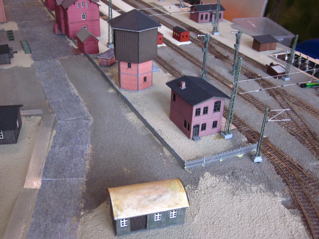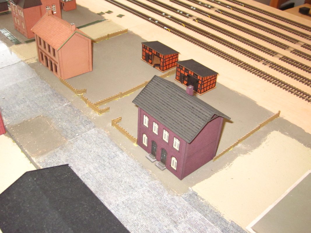 Von den Eisenbahnergrundstücken ist ein Teil auch schon umzäunt (Bastelkiste). Das mit dem Beamtenwohnhaus wartet noch darauf (Bastelkiste).