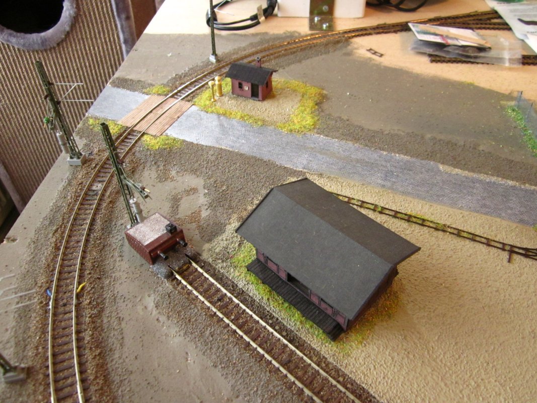Ein wenig mehr Grün für die Grundbegrünung ist hinzugekommmen. Ich habe vorher schnell noch das Abspannjoch an der Segmentdrehscheibe gebastelt und aufgeklebt. - Ein Fehler ist mir dabei aber unterlaufen.