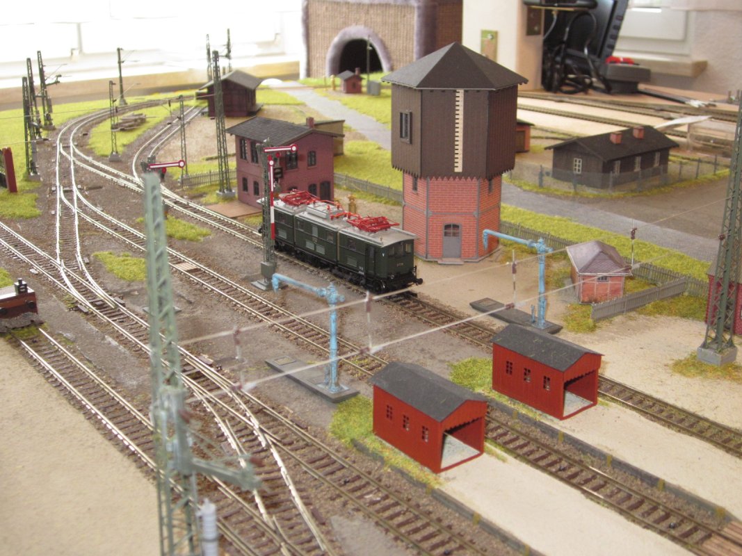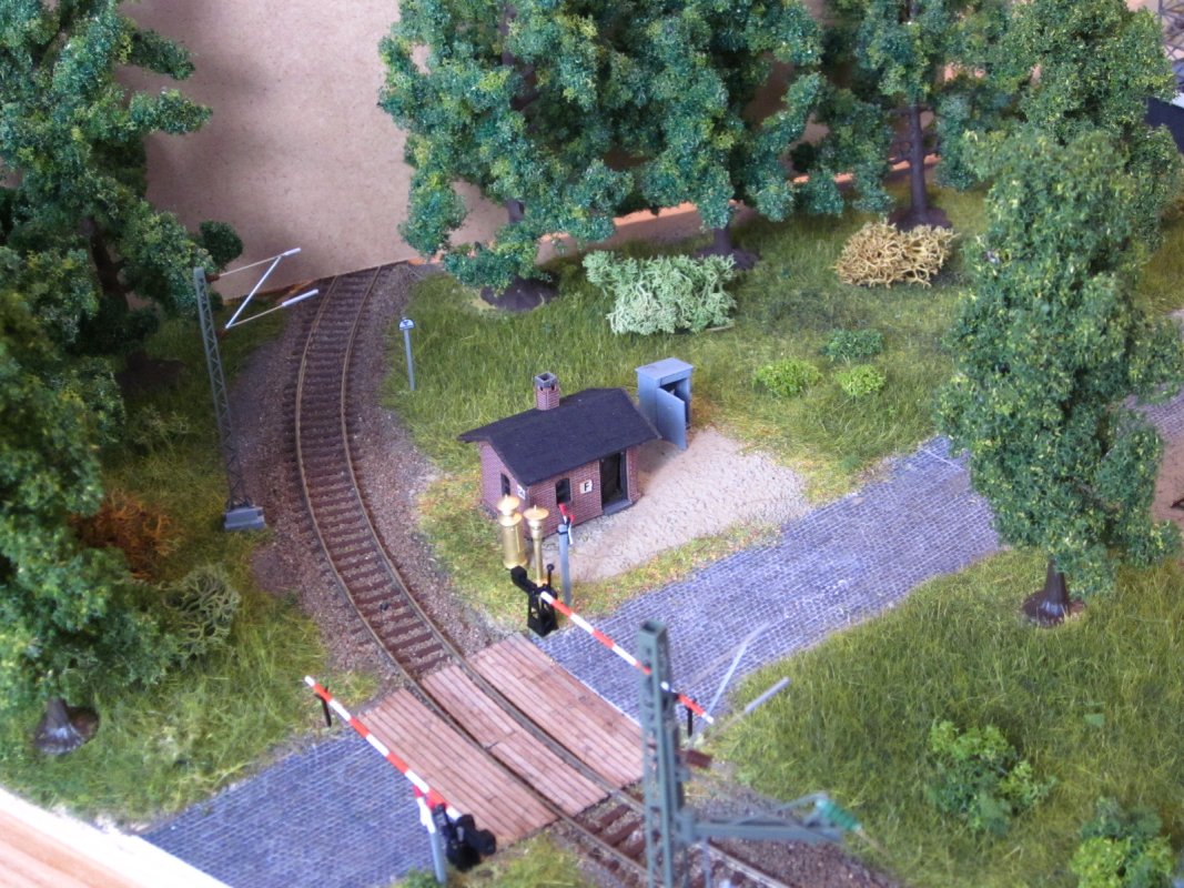 Auch die Schrankenanlage steht und die Signaltafeln sind alle aufgestellt. Es fehlen noch Rohrgeländer. Die Weichenlaternen sind schon vorbereitet, werden aber erst später an ihre Stellen geeklebt. Endlich aber muß auch die Hingtergrundkulisse angebaut werden. Und die Läutewerke sind noch zu lackieren!