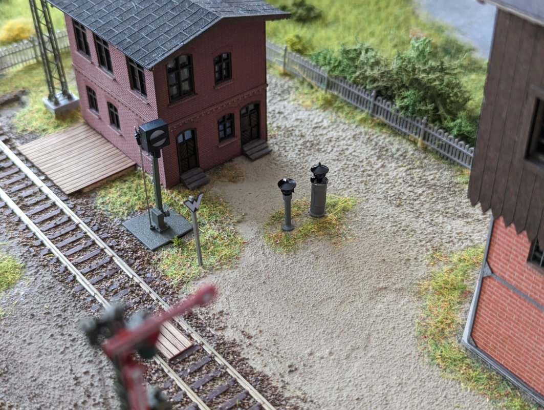 Die Läutewerke wurden lackiert und aufgestellt. Ebenso die Schrankenkurbeln. Außerdem gibt es jetzt die Weichen- und Gleissperrsignale, sowie - etwas schlecht erkennbar und auch etwas mißlungen - Grenzzeichen. Für die Andeutung der Gleissperren habe ich auch schon eine Idee.