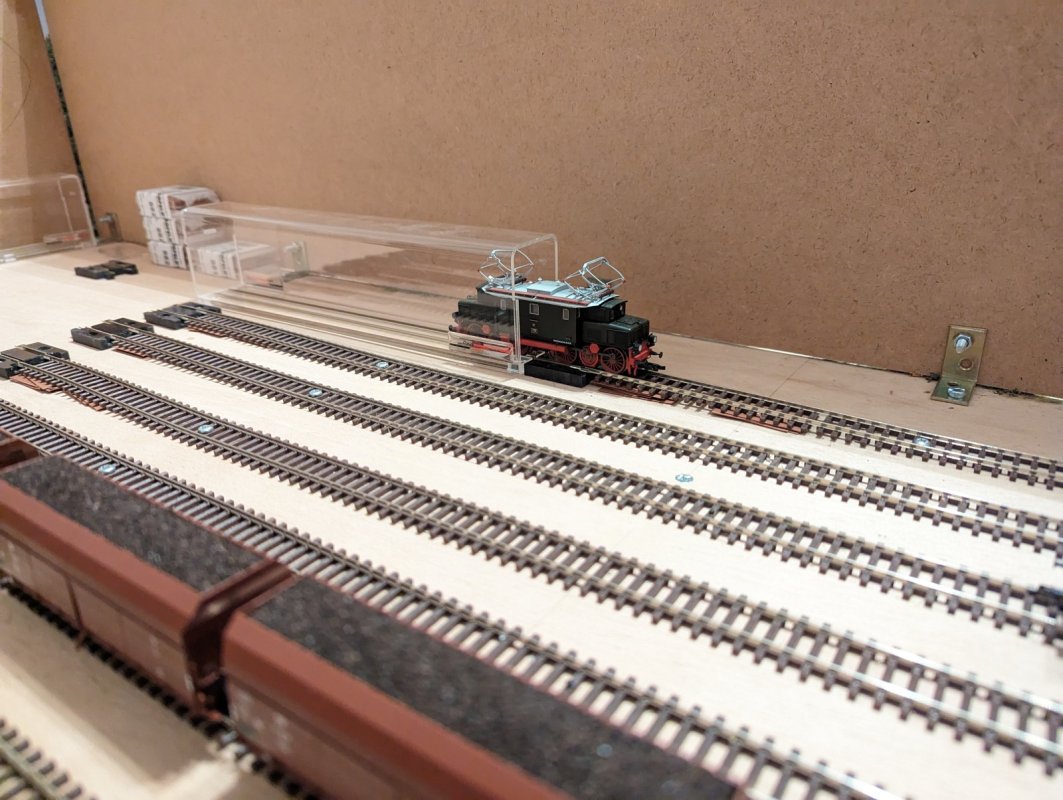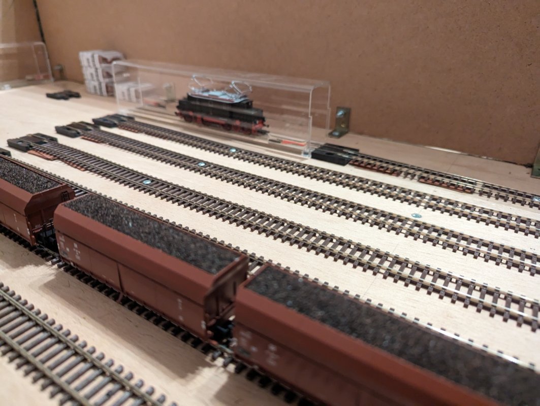 3.) Nein, das sind keine Entkuppler! Den Schattenbahnhof beobachte ich über eine Rückfahrkamera. Durch die weißen Kartonstückchen sehe ich, ob ein Zug weit genug im Gleis steht, ohne die Nachbarn zu behindern.