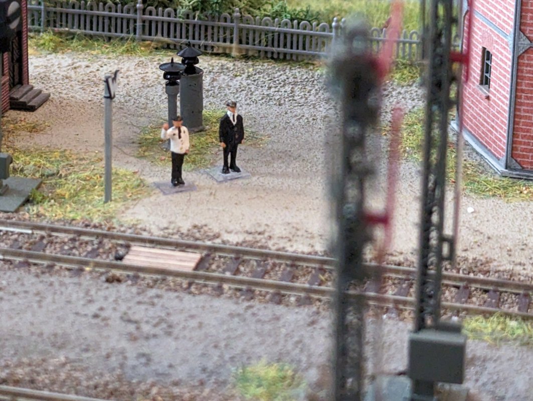 - Am Stellwerk stehen Herr Brodersen und Herr Godfredsen und freuen sich über den reibungslos ablaufenden Bahnbetrieb. (Naja, so reibungslos läuft es bei mir noch nicht.)