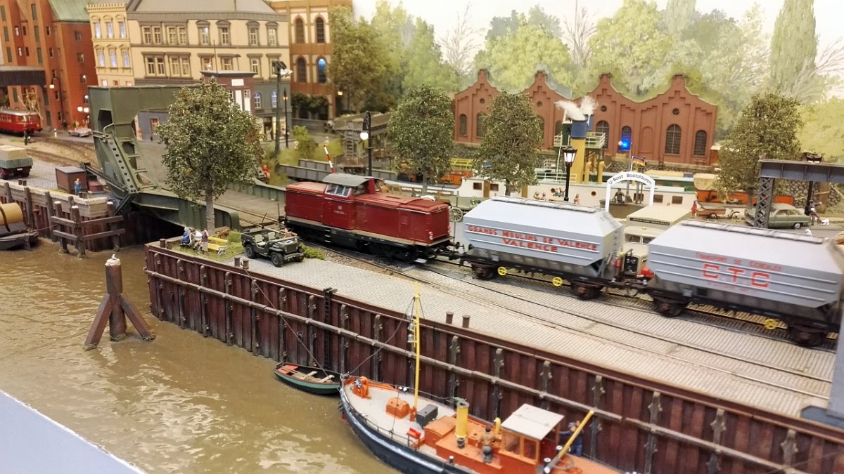 Beeindruckend, was in Z alles möglich ist. Leider war die Anlage stets dicht umlagert und durch das Tempo der Züge ist leider eine gewisse Unschärfe vorhanden. Aber durch die Hintergrundkulisse wirkte sie bombastisch. Auch die fahrenden Autos und die detailreiche Gestaltung der Landschaft war beeindruckend.