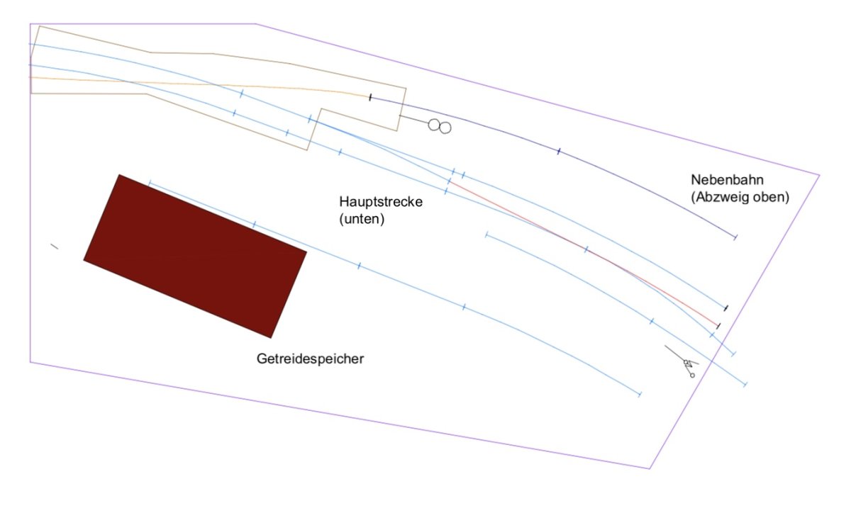 Es besteht die Illusion, dass die gerade Hauptstrecke überquert wird. Tatsächlich verschwenkt sie und läuft eine Etage tiefer als die Nebenbahn in den Gleiswendel ein.