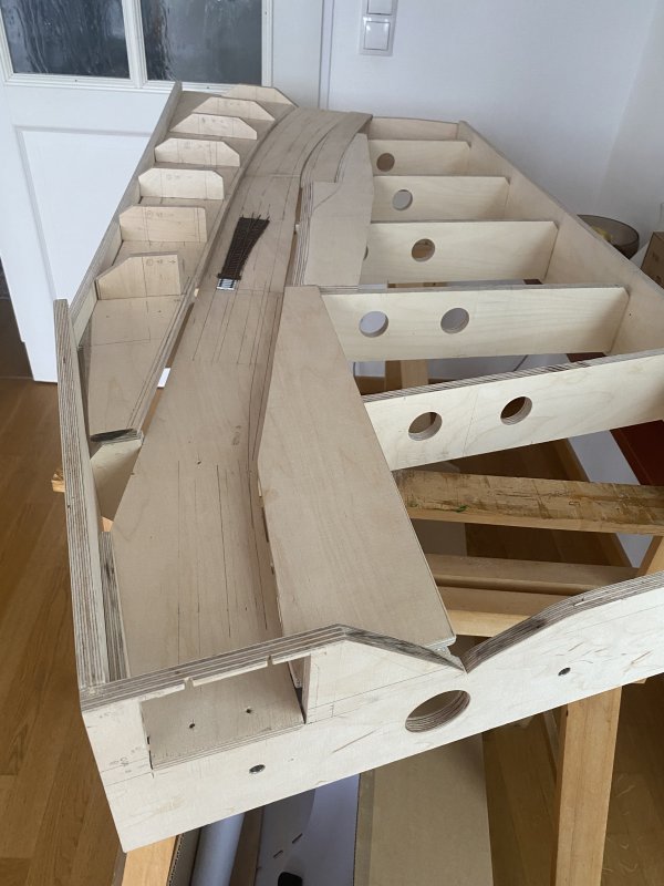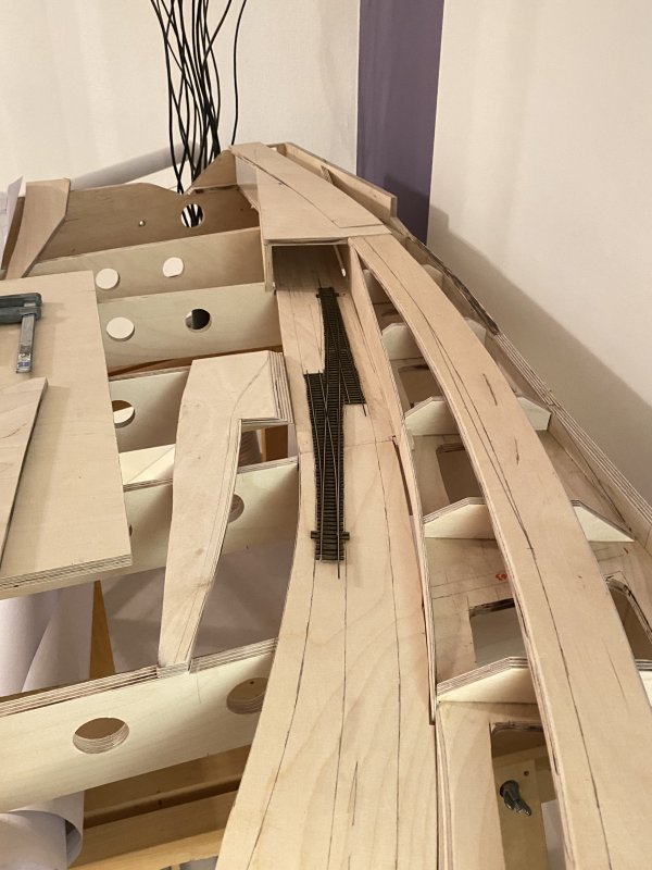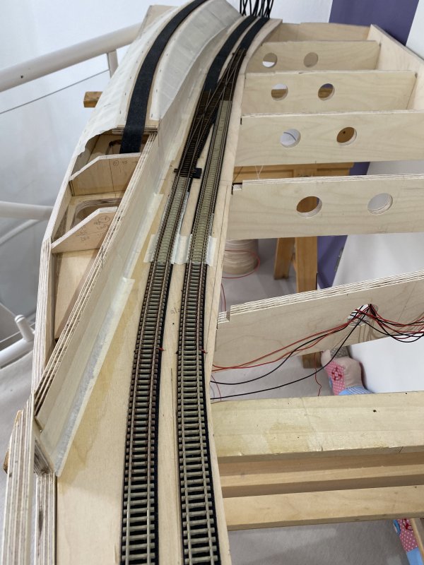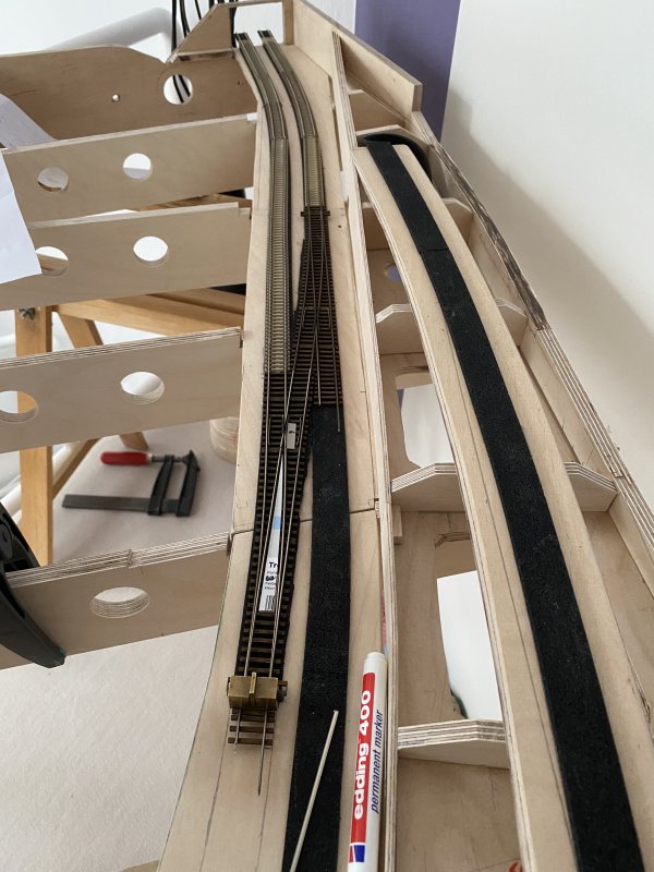 Bevor ich den „Deckel“ schließen kann müssen alle darunter liegenden Installation erledigt werden: Gleis, Schotter und die Oberleitung. Letztere soll gespannt werden. Ich arbeite auch an der Modellierung des Damms. Viele Dinge gleichzeitig und das Projekt zieht sich.