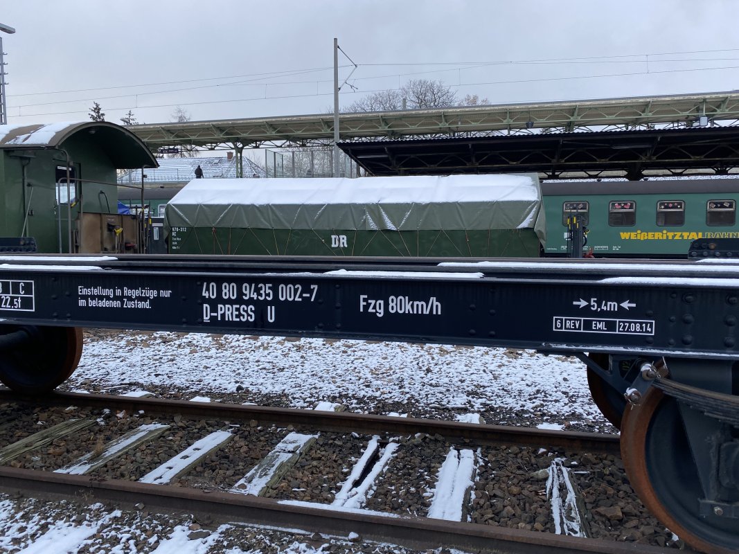 Die Anschriften sind gut zu erkennen: "7.290 kg". Für den Transport mussten die Schneeräumer demontiert werden. Laut einem Messegespräch, das ich mal zufällig mitbekommen habe, passt die IV K von Veit nur ohne Schienenräumer auf den Wagen.