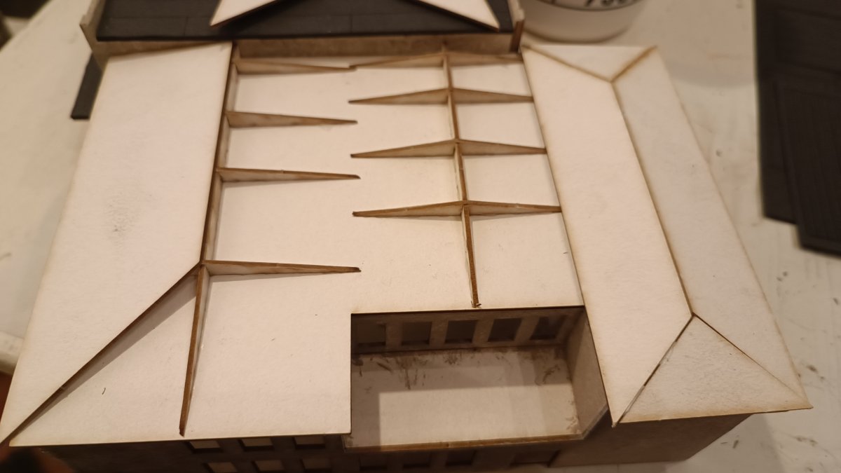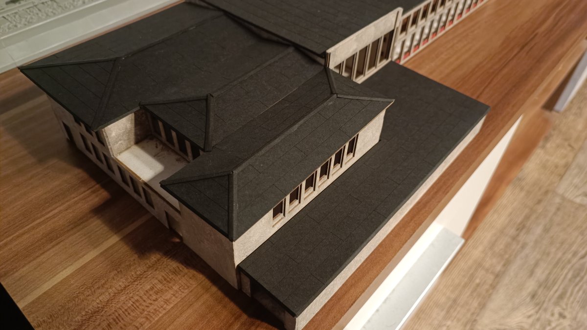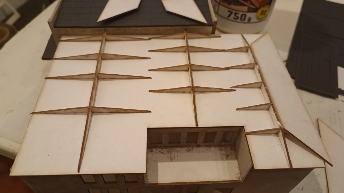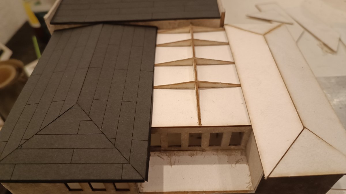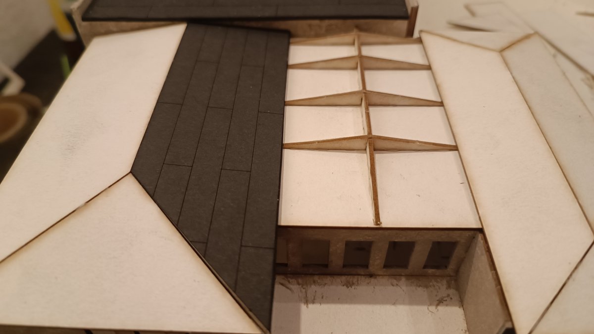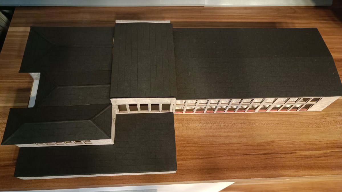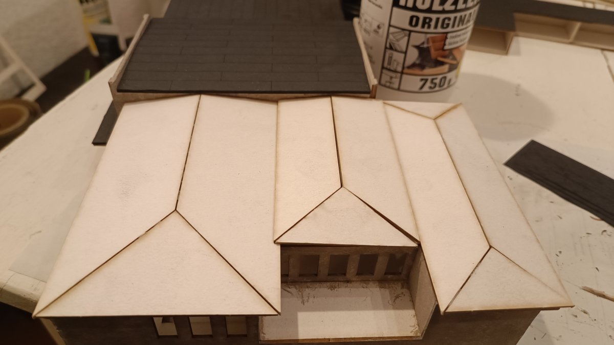 Beim Aufkleben der Dachplatten habe ich mit der rechten Dachfläche begonnen, danach die linke, diese wurde dann auch als erstes mit der Dachpappe beklebt, danach die rechte Dachseite, ehe schlussendlich die mittleren Dachplatten eingeklebt und mit Dachpappe versehen wurden.