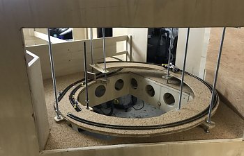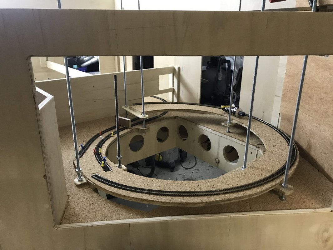 Ein Gleiswendel von ca.750mm mittlerem Durchmesser sorgt für Verbindung der verschiedenen Höhen. Hier versuche ich dringendst eine Steigung von ca 2 % einzuhalten, um vernünftige Befahrbarkeit zu gewährleisten. Die Trassenbretter werden mittels Gewindestangen im Abstand eines Viertelkreises nach oben geführt. Damit lassen sich dann auch die Höhen super justieren. Hier soll der von unten mögliche Einstieg für spätere Revisionen und Bergungen dienen.