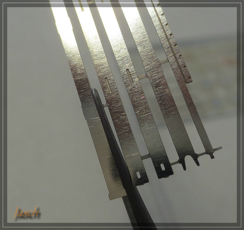 Die Teile sind so gezeichnet, dass ein Rechtshänder beim raustrennen der Teile kaum Nacharbeit mehr an den Ätzteilen hat. 1mm Platz reicht für eine gute Nagelschere völlig aus.