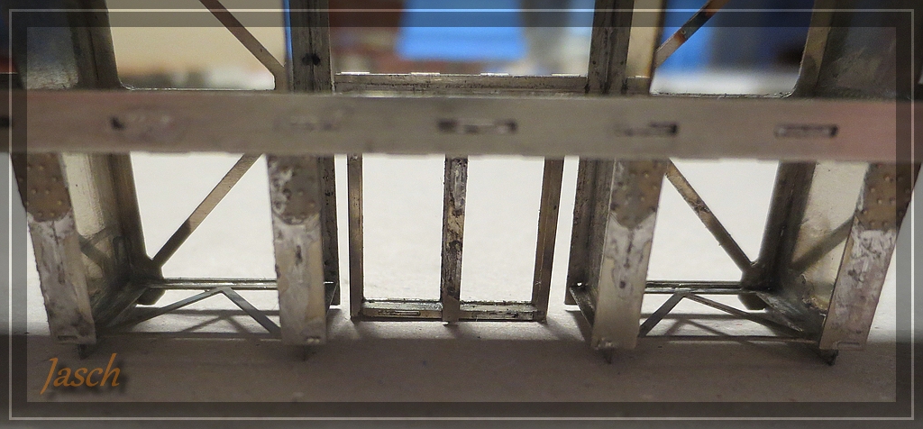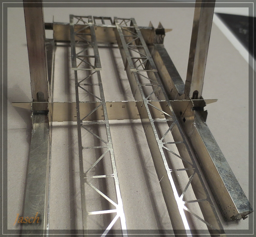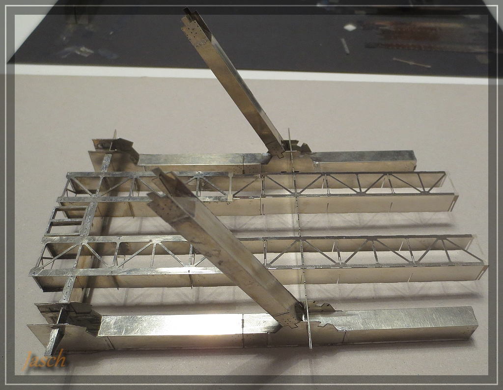 Das Verlöten der Kästen ist nicht ganz so einfach, mit etwas Übung aber gut zu händeln. Die Streben bestehen aus 5 einzelnen Teilen. Die seitlichen Teile haben Einätzungen in denen, die am Ende der Strebe nach innen gehenden Teile, einrasten. Diese habe ich bei der zweiten Diagonale erst gebogen als ich die Seitenteile schon verlötet habe, ist einfacher. Ich werde bei den nächsten Streben Fotos davon machen. Die Streben stehen noch lose in ihrer Position.