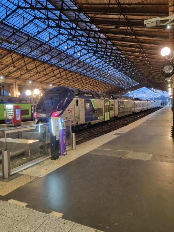 Zur nächsten Bahnstation, dieses Mal RER. Das war ein Eindruck, Doppelstöckig im Tunnel, eine Länge die nicht abbildbar war, Anfahrgeschwindigkeit enorm und 5 Plätze in einer Reihe (Oberstock)