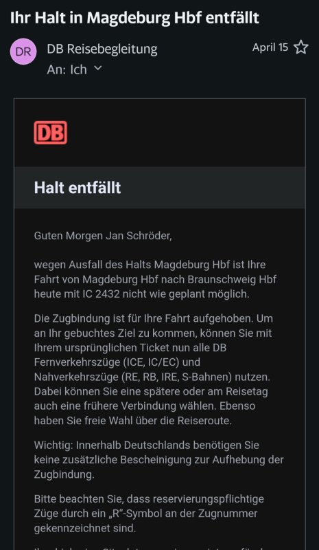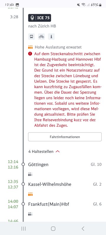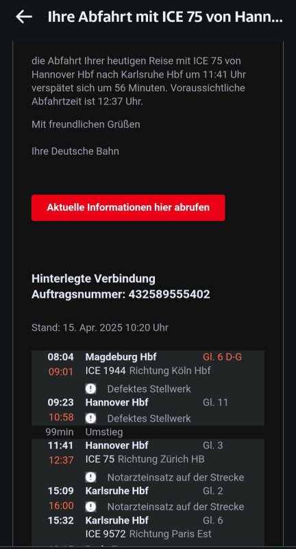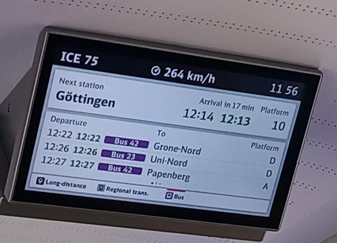 Und auch unsere Anzeigetafel zeigt den Ausfall an. Was nun? Sohn war schon weg, durch Baustellen auf A2 wäre Braunschweig nicht mehr pünktlich erreichbar, also auf Alternative Verbindung gedrückt.