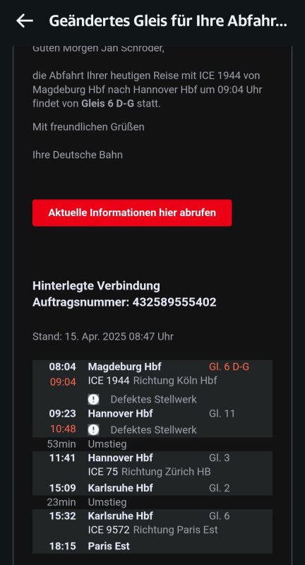 Huch, das ist ja der ICE im Nachbargleis, also rein da. Der Wunsch von mir mit dem TGV zu fahren war damit flöten gegangen. Jetzt kam auch die Info warum von Magdeburg nix mehr in Richtung Westen fuhr und alles stand.