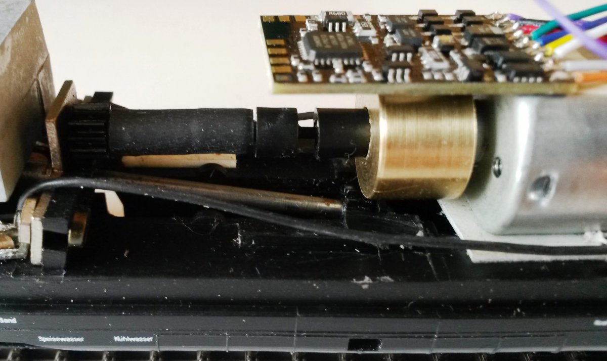 Habe mir bei dieser Firma einzelne Motoren (gleich für die BR92 mit) von Mashima mit Schwungmasse und Antriebswelle für je ca. 30 Euro beschafft. Dieser ist dann auf dem Motoradapter platziert worden und mit doppelseitigem Klebeband und Kupferdraht befestig.