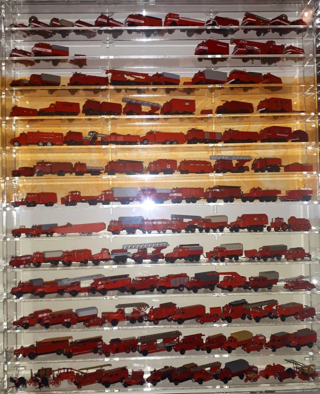Dazwischen sind die Auhagen H0/TT-Garagen gut zu erkennen (wobei die hinten rechts nur wegen der Maße der Vitrine so dicht stehen, da sich hier sonst die Freifläche für Übungen befinden würde).