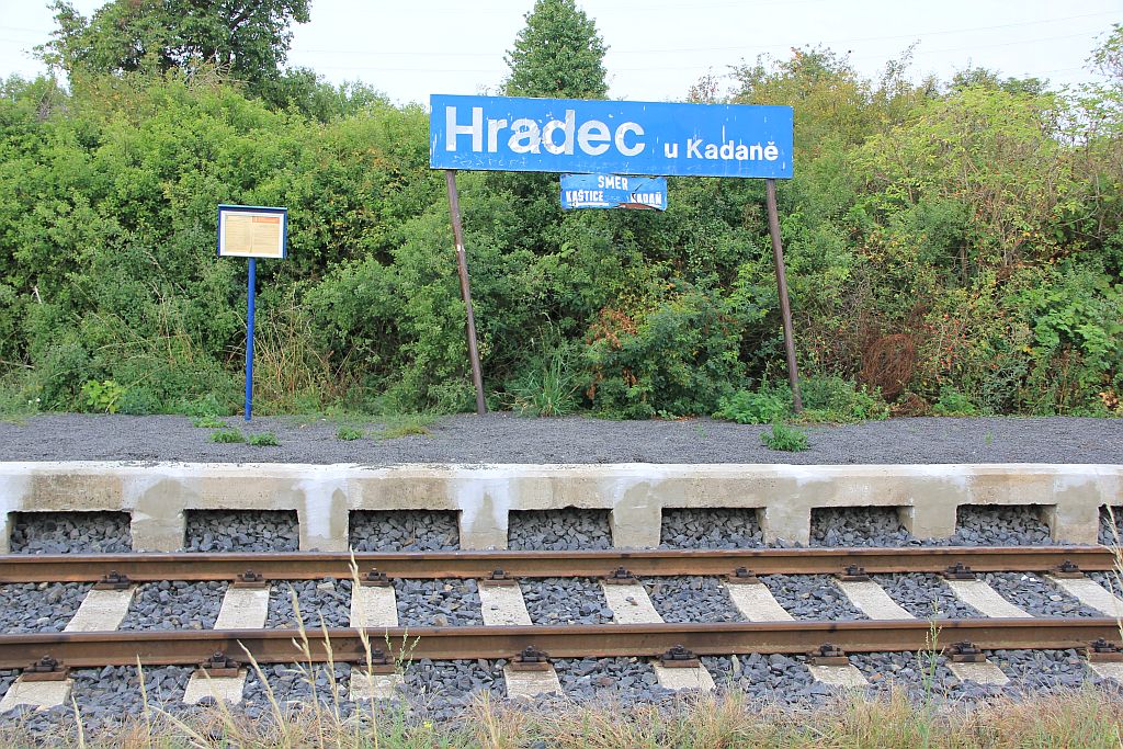 Der Haltepunkt Hradec u Kadaně weist heute nach einer Oberbauerneuerung nur noch das durchgehende Streckengleis mit „Hochbahnsteig“ auf. Alte Karten lassen zumindest auf ein Nebengleis und ein EG schließen. Einzelne Regelzüge von Kadaň-Prunéřov sind bis hierher verlängert. Hinter dem Ort folgt ein von Landwirtschaftsflächen umgebenes Anschlussgleis zum Umspannwerk Hradec. Die riesige Anlage dient der Lastverteilung (5 x 400 kV und 2 x 220 kV) und als Knoten im europäischen Stromverbundnetz.