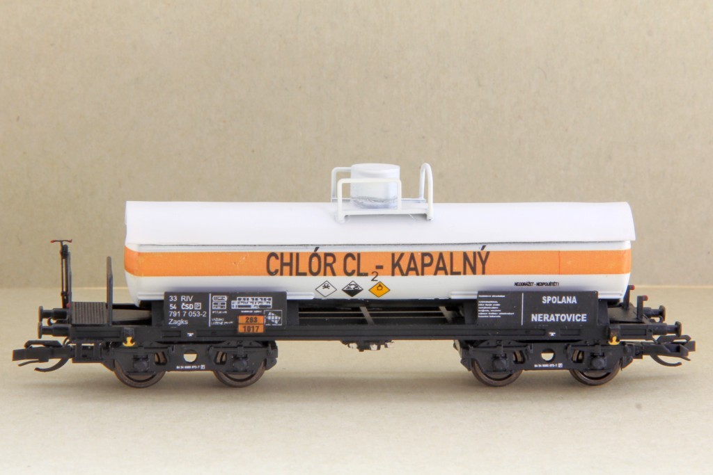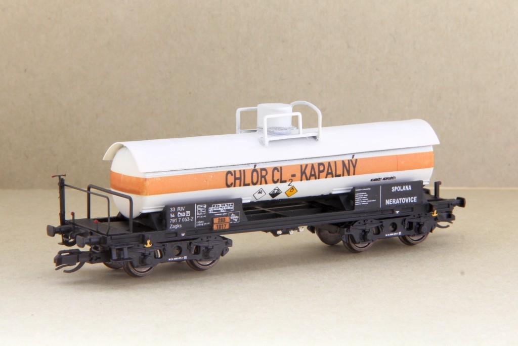 Nach dem Lackieren wurden Kessel und Fahrgestell zusammengefügt. Als Beschriftung diente ein Decalbogen von Mojett. Außer dem Umstand, dass er für die Epoche 5 gedacht ist, was eine Tilgung von „ČD“ in der Anschrift und „a.s.“ im Firmennamen und ein Einfügen von ČSD erforderlich machte, hat er einige typisch dahingeschlamperte Mängel aufzuweisen: