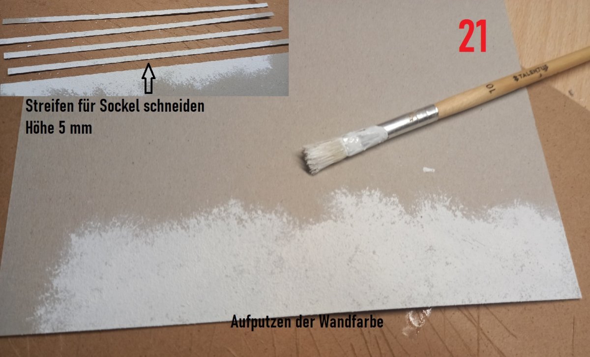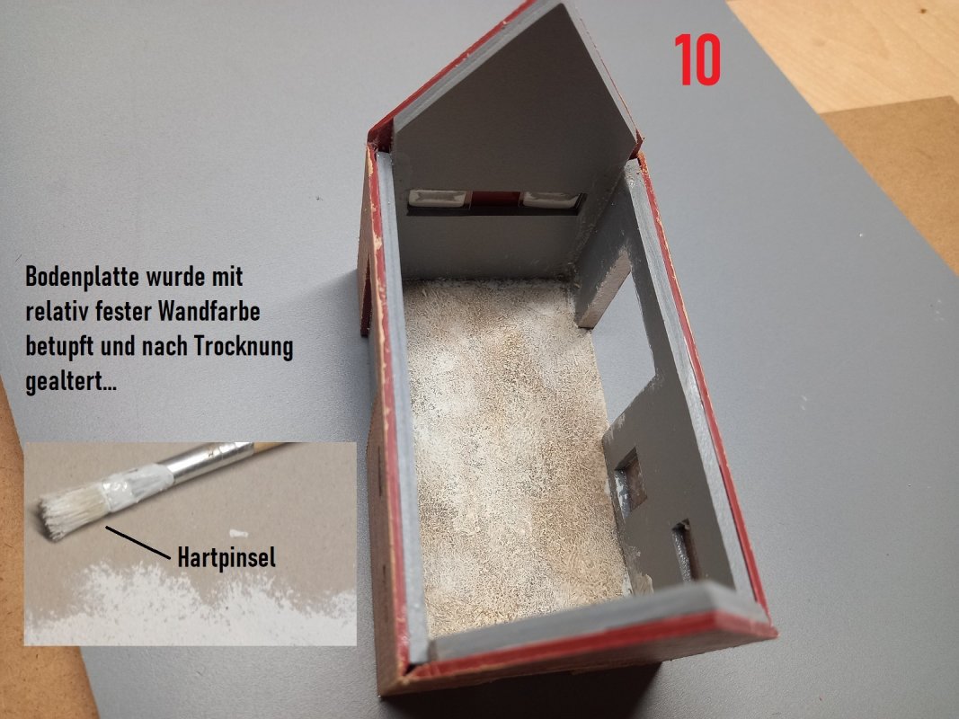 Nehmt nun etwas angedickte Wandfarbe und tupft diese mit einem kleinen Hartpinsel gleichmäßig auf die Bodenplatte. Ein 2.Mal ,falls es noch nicht deckt.