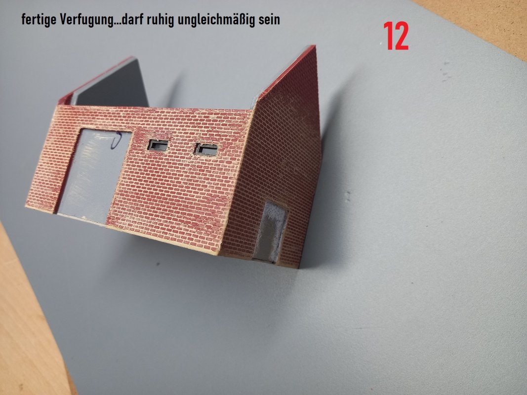 Hier bereits zu sehen...das getrichene Dach. Ebenso mit Alterungs versehen....dünne schwarz/braune Farbe auftragen.