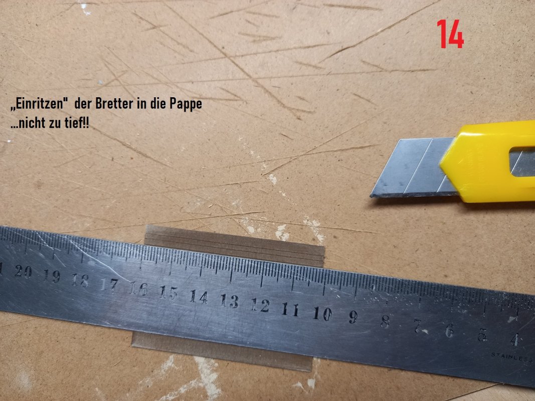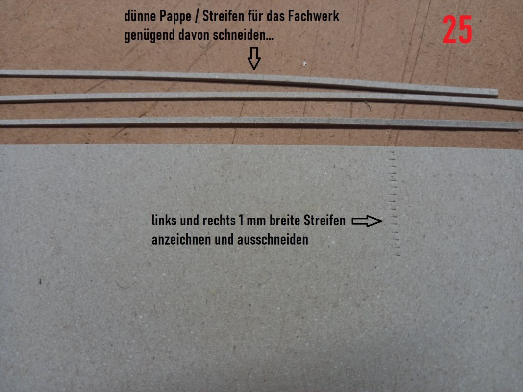 Aus einer dünnen Pappe wird nun die Dachlattung angefertigt. Dazu gleichmäßige Streifen schneiden...max 1mm breit.