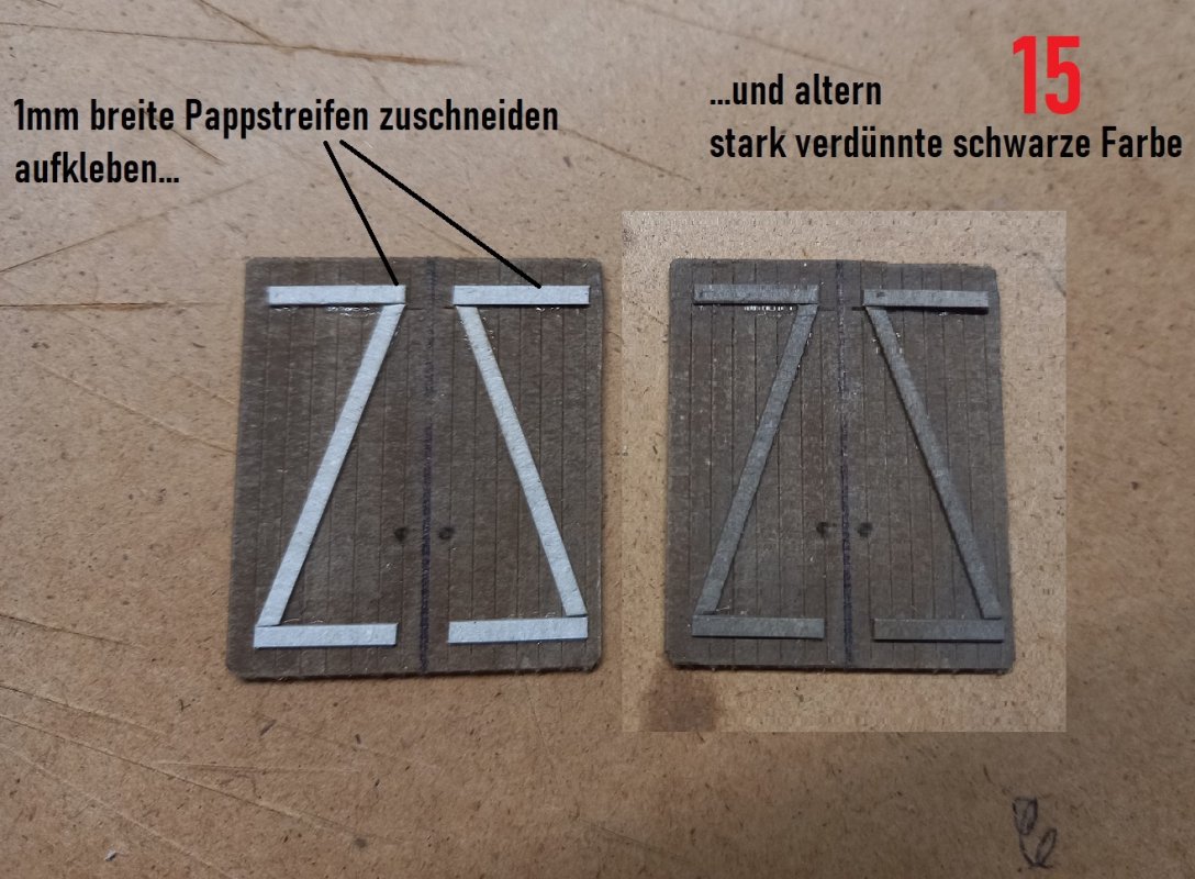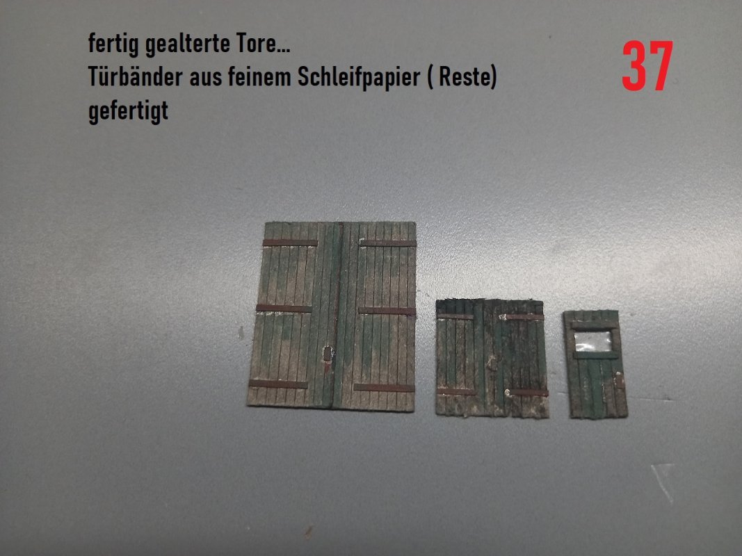 ...hier bereits zusehen,die fertigen Tore/Tür. ...die Tür wurde baulich mit einem Fenster versehen. Wie es jeder mag,so anfertigen.Die Tore /Tür wurden mit stark verdünnter schwarzer Farbe gestrichen. Nach Trocknung erfolgt ein erneuter Auftrag mit grüner Farbe.