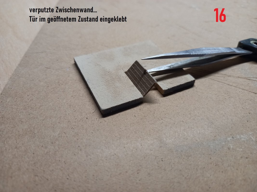 Inzwischen werden die Türbänder gefertigt. Reste von feinem Schleifpapier ( Körnung 180 oder feiner) dienen dazu.