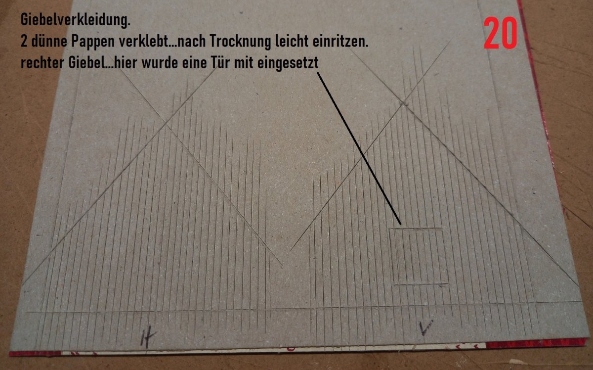 Ist die Dachfarbe trocken werden noch die Giebelenden (am Dach) mit Holz verkleidet. 3mm breite Pappstreifen schneiden und siehe Bild aufkleben.