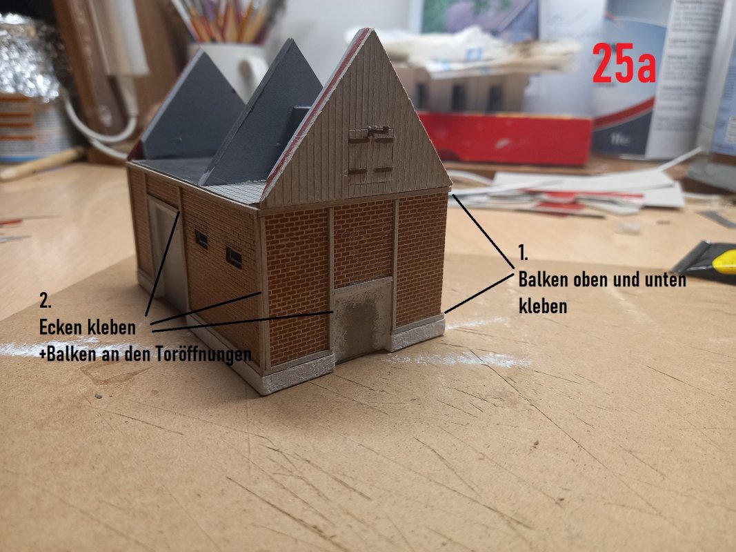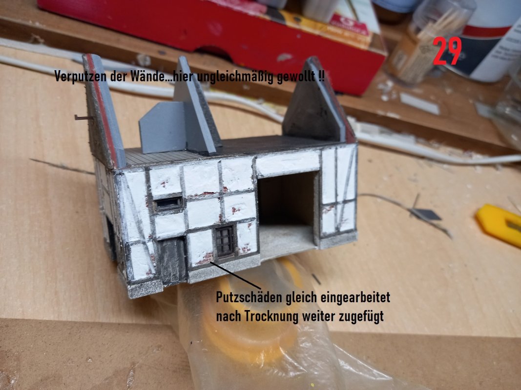 Die Balken ( Pappe) sind sehr dünn und fallen als solche kaum auf.Wem es so gefällt und das Gebäude nicht verputzen will kann hier pausieren und später am Dachbau weiter machen.
