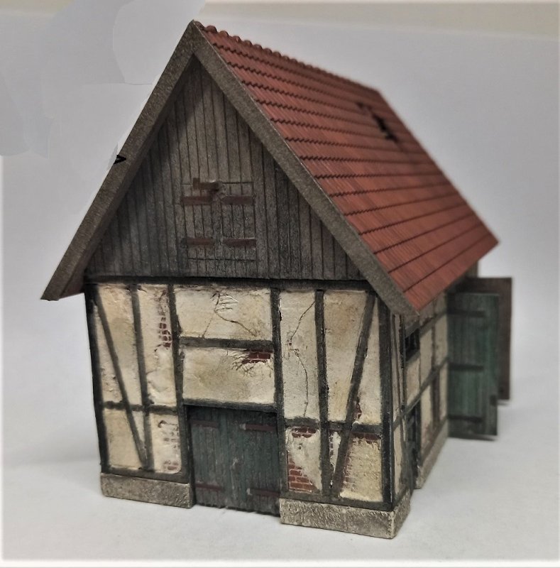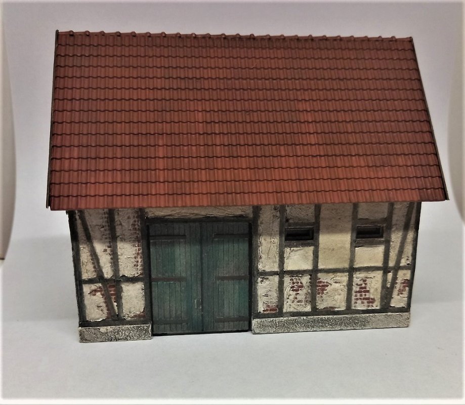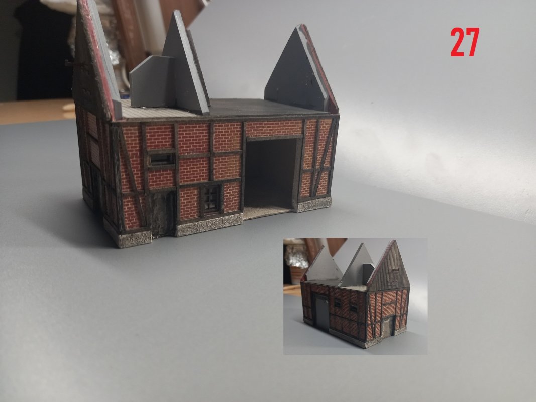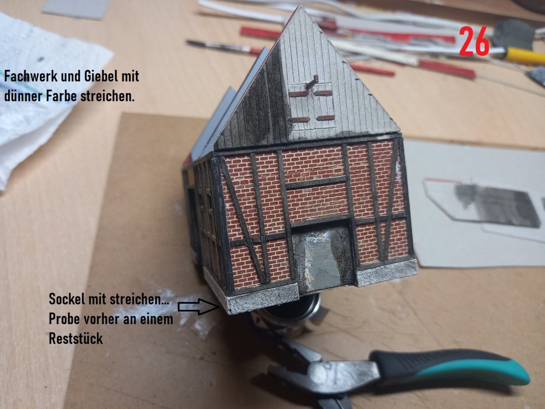 Hier nun das Gebäude fertig geputzt und gealtert...die Balken wurden noch einmal mit schwarzer dünner Farbe nachgestrichen.