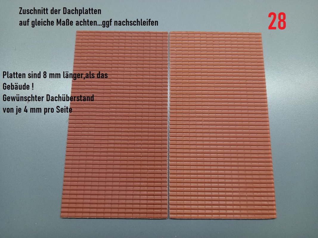 Also Dachplatte 8mm länger,als die Seitenlänge der Scheune. Dachüberstand an den Seiten beträgt 2 Ziegelreihen...