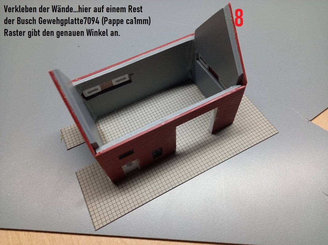 Ist alles fertig verkleben wir die Wände. Als Bodenplatte habe ich die Busch 7094 (Pappe ca 1mm dick) gewählt. ( Rest aus der Bastelkiste)